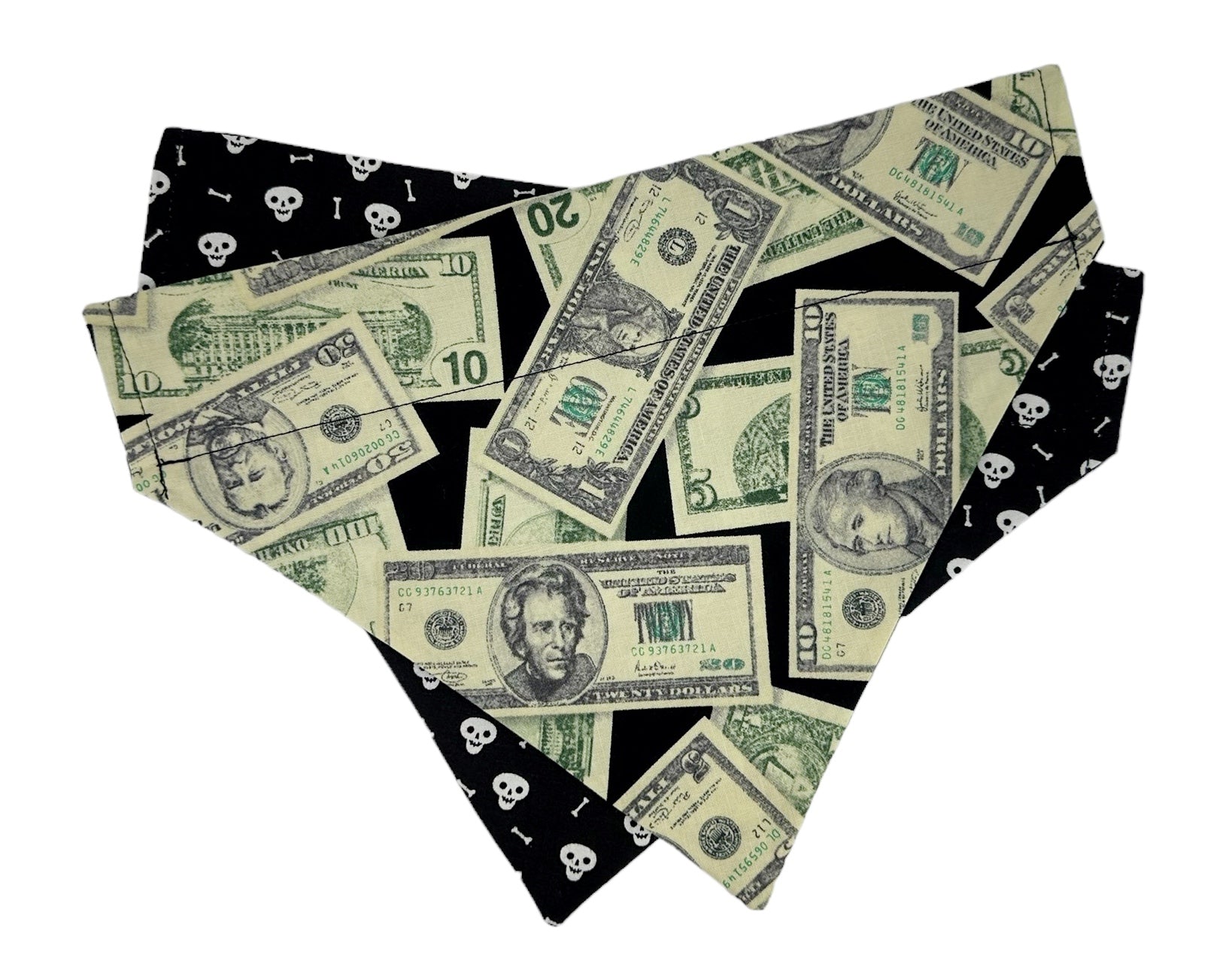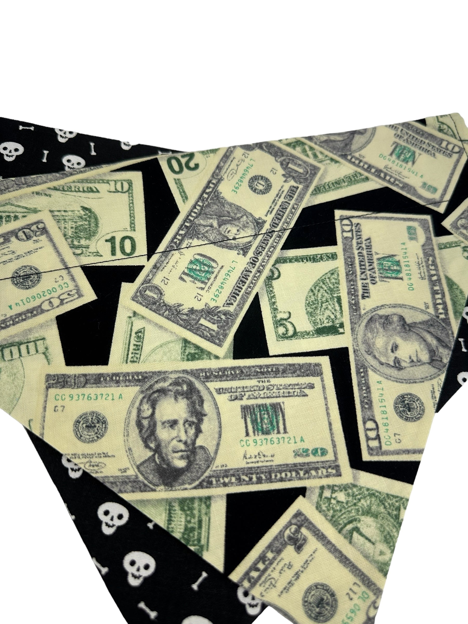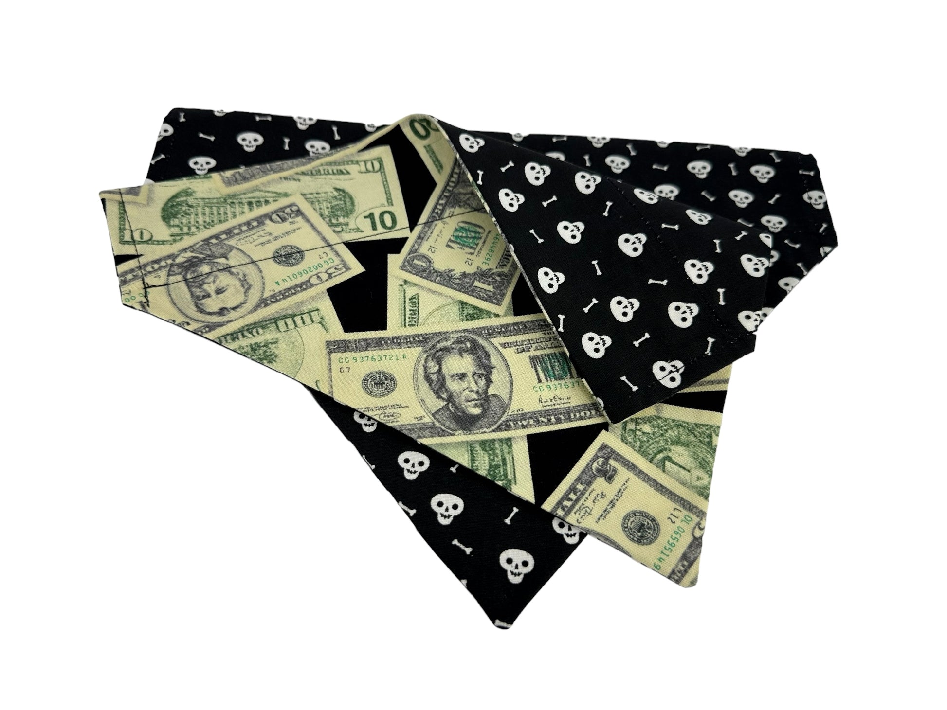 Get ready to turn heads with our 100 Bones Glow-in-the-Dark Handmade Reversible Slip-on Bandana! Your pup will be stylin' with this cool glow-in-the-dark skull and crossbones design (perfect for night walks) and reversible U.S. Money images on the other. No matter what side you choose, your dog will rule the streets (and the dog park) with their new swag!