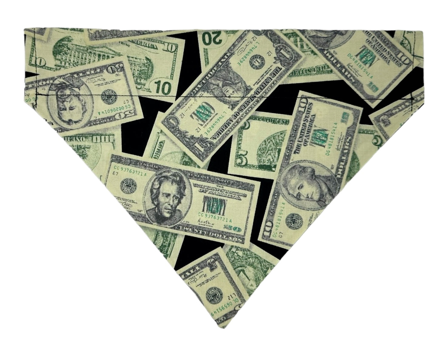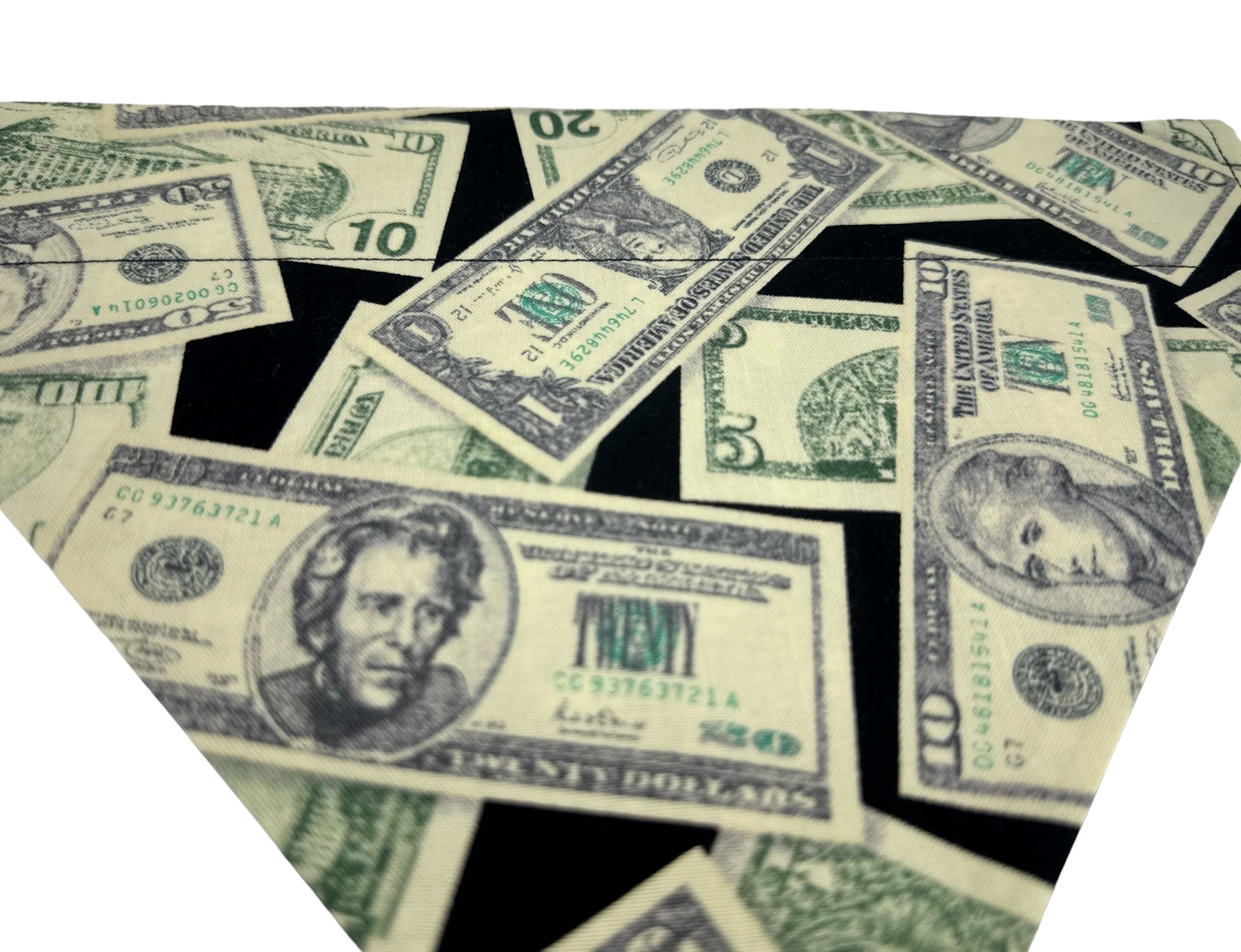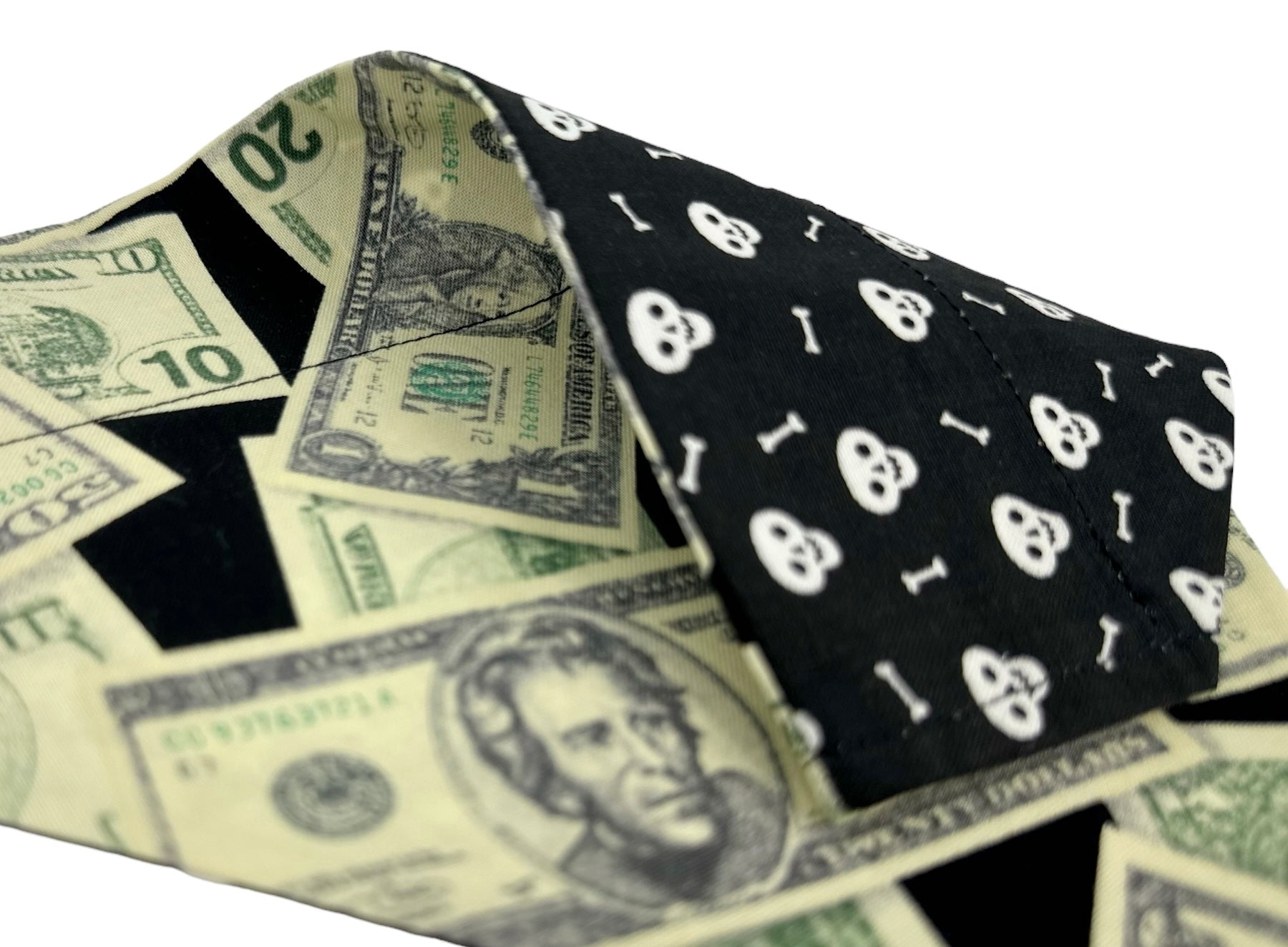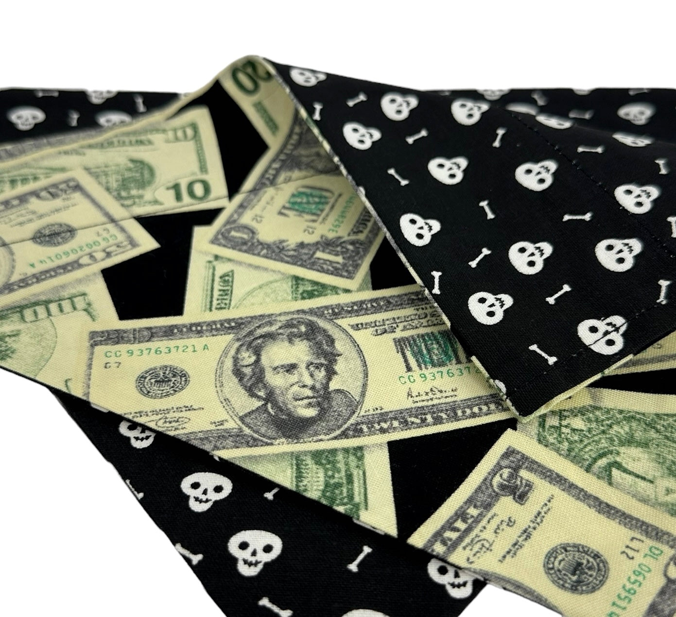 Get ready to turn heads with our 100 Bones Glow-in-the-Dark Handmade Reversible Slip-on Bandana! Your pup will be stylin' with this cool glow-in-the-dark skull and crossbones design (perfect for night walks) and reversible U.S. Money images on the other. No matter what side you choose, your dog will rule the streets (and the dog park) with their new swag!