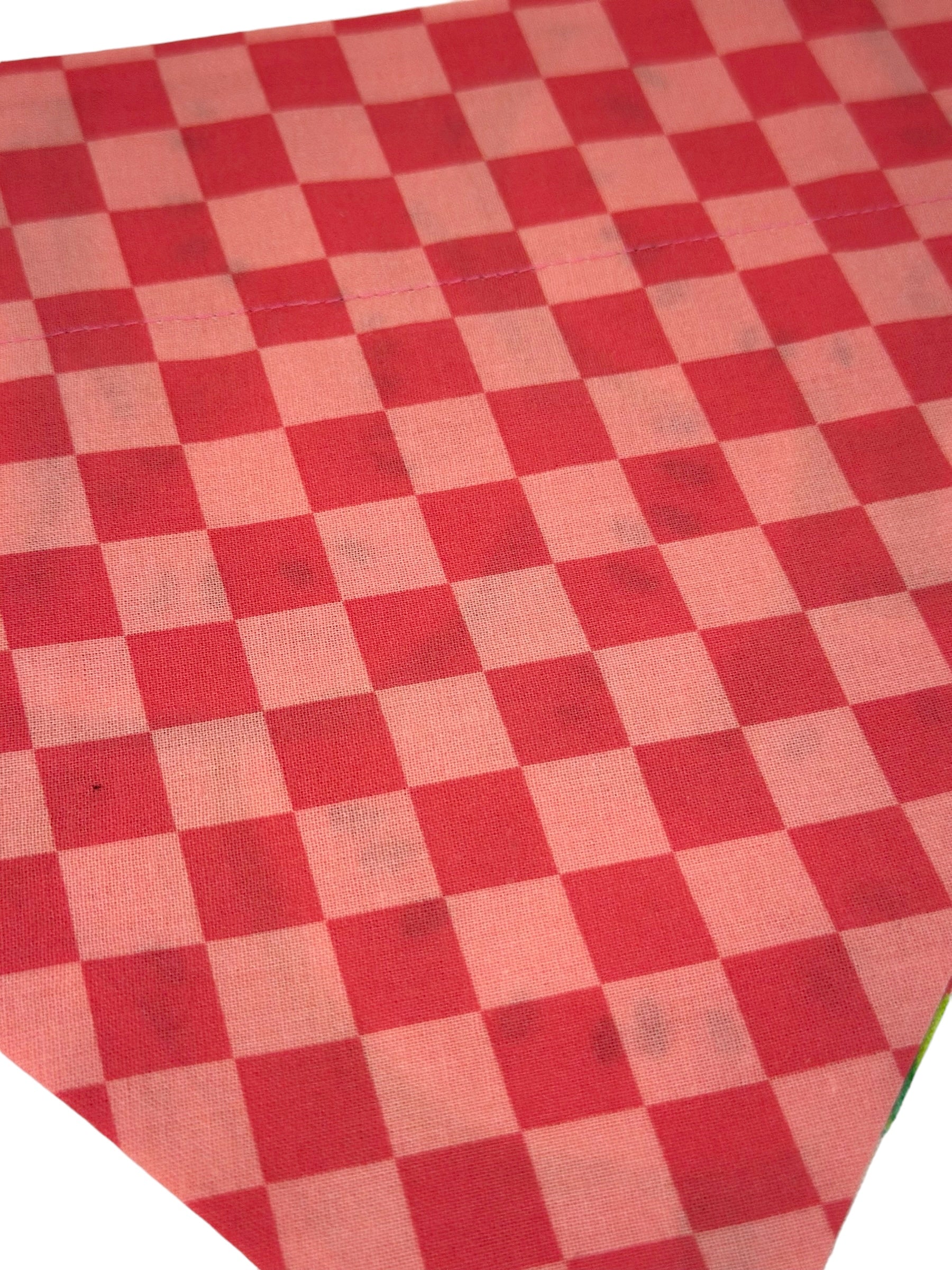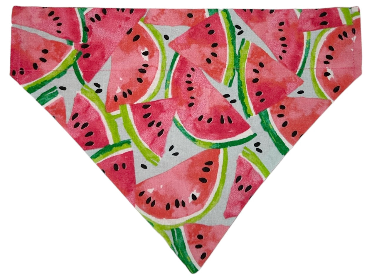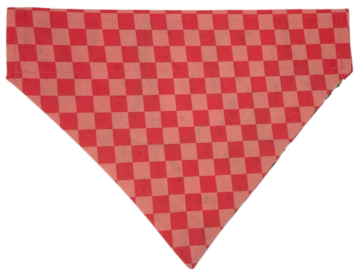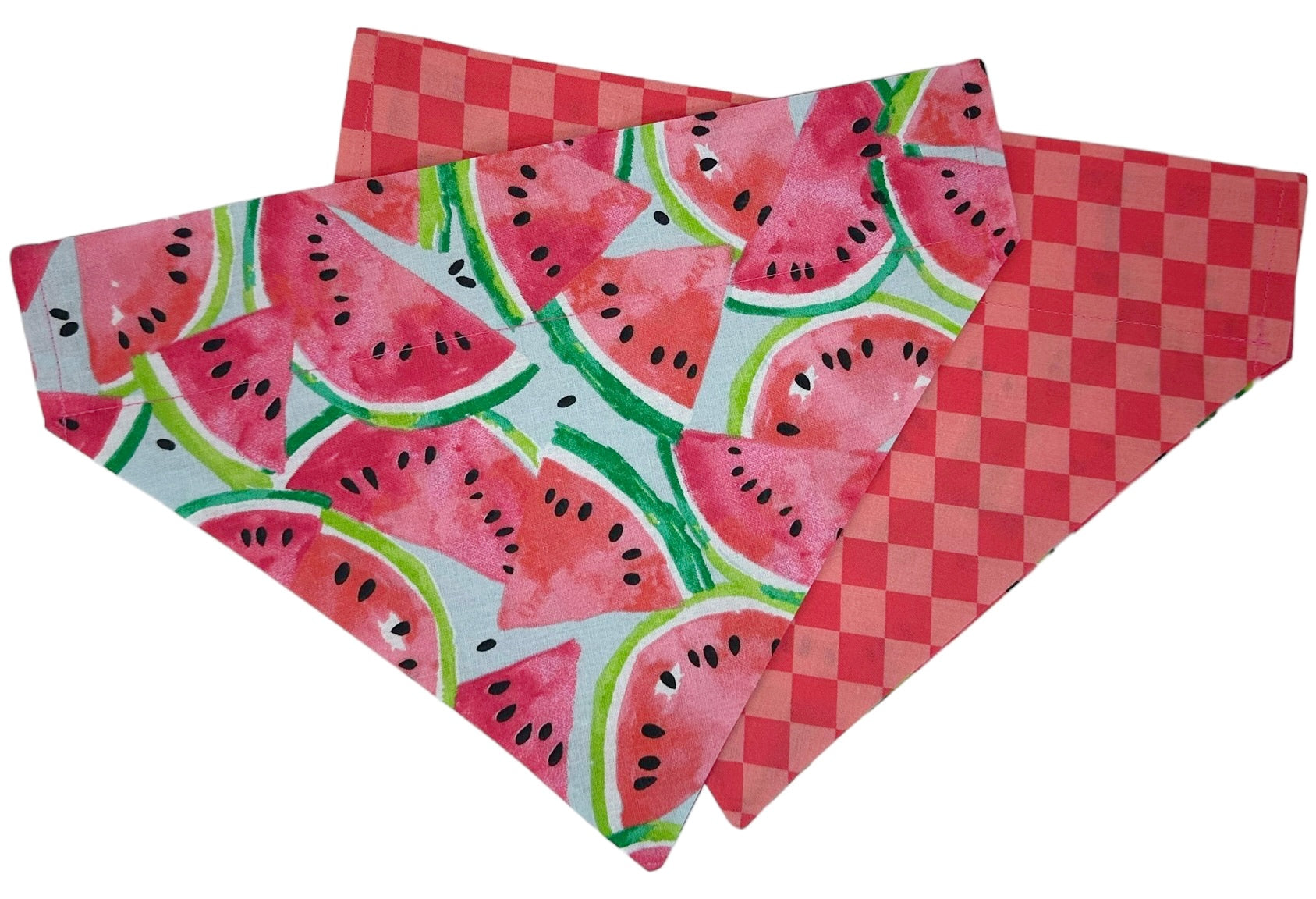 Add a juicy twist to your dog's summer style with our Watermelon and Pink Picnic Handmade Reversible Slip-on Bandana. Made with 100% cotton, it's perfect for those hot summer days. Plus, it's reversible for a fun and fashionable look!