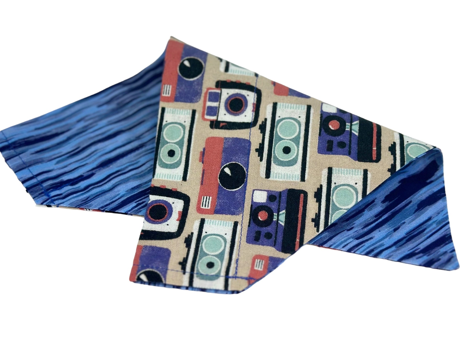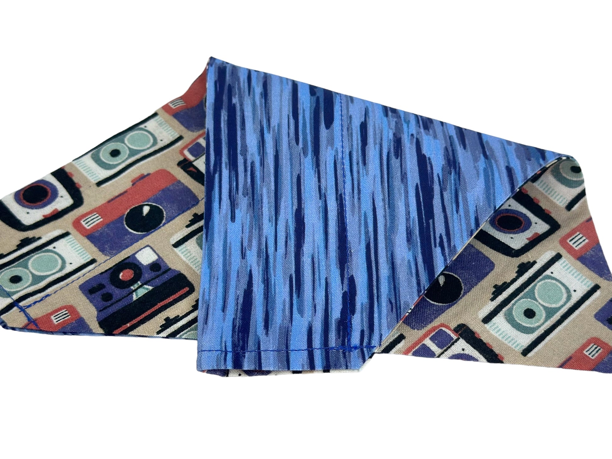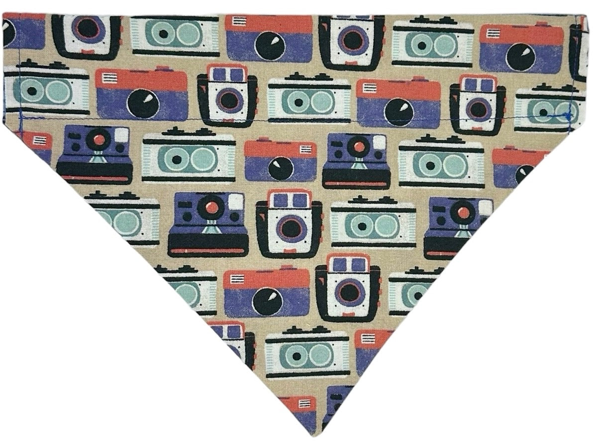 Lights, Cameras, ACTION!!!! Introducing our Camera Moment handmade reversible slip-on bandana! Keep your pup camera ready as the center of attention in this reversible multi-camera and blue abstract-themed bandana. This show-stopper is sure to add some cool style to your furry friend's accessories.