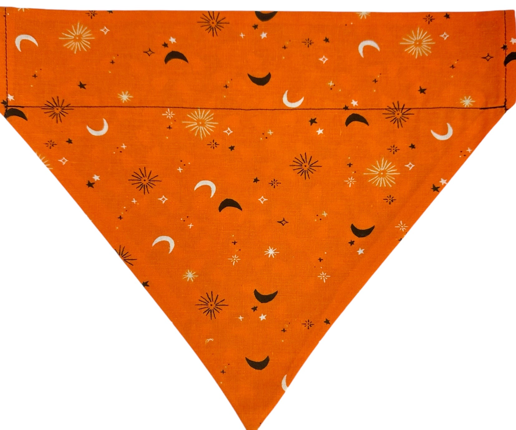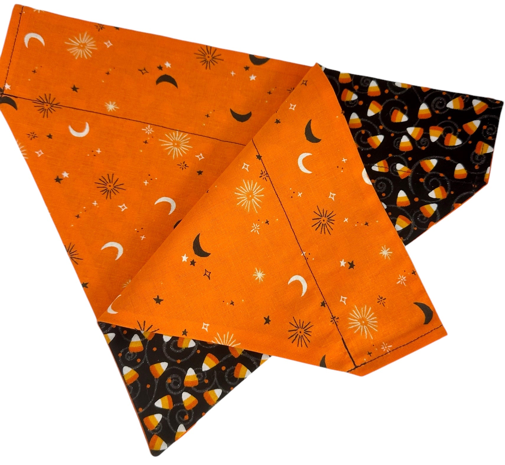 Transform your furry friend into a celestial candy corn with our handmade reversible bandana! Perfect for spooky season, this bandana features a vibrant candy corn design on one side and a celestial pattern on the other. Trick or treat in style with this fun and unique accessory. Shhh, don't tell, but it also makes for a great Instagram photo.