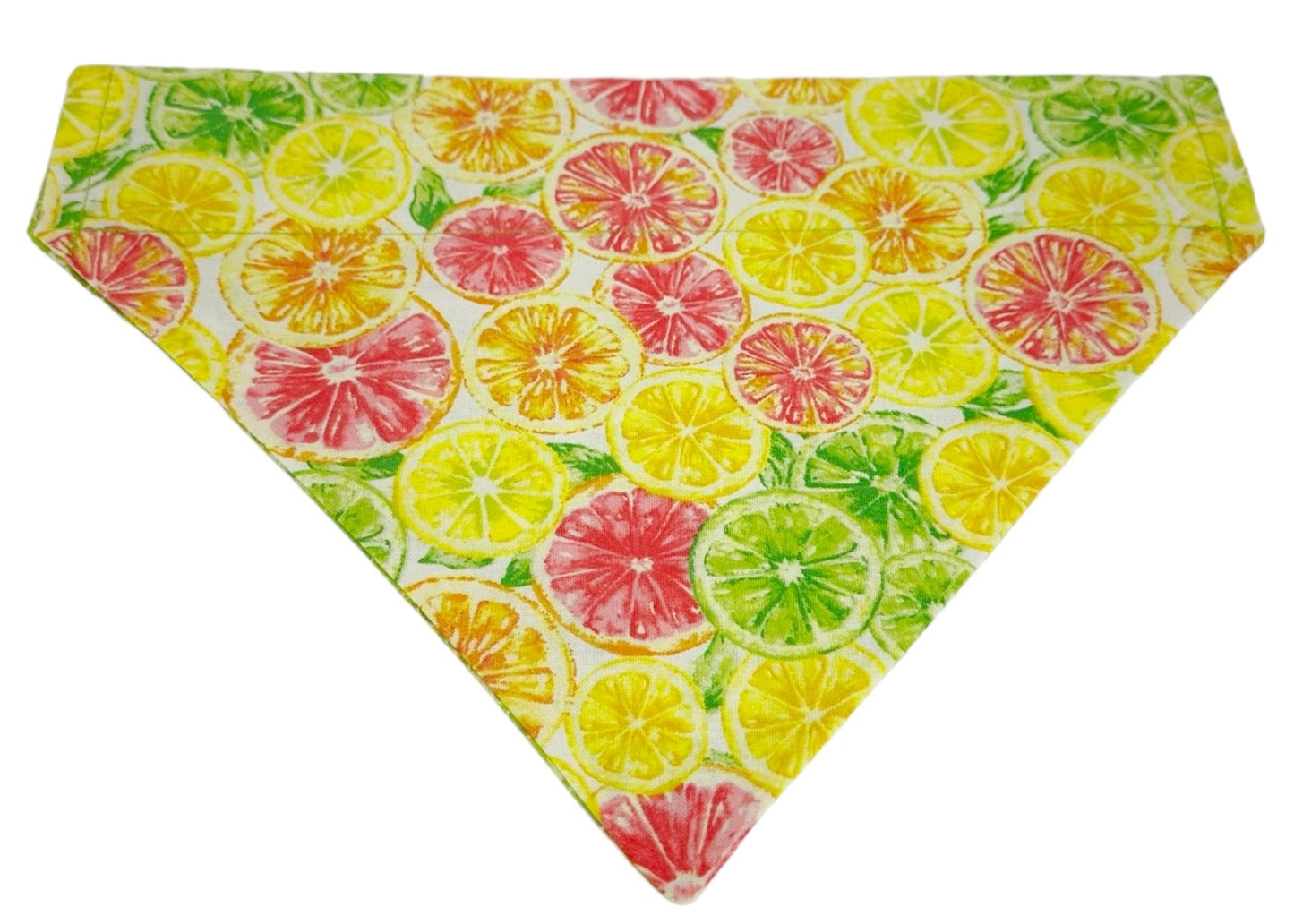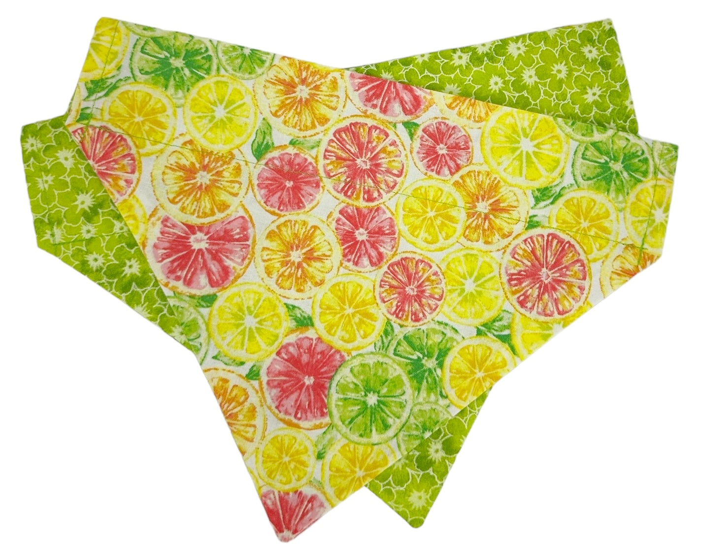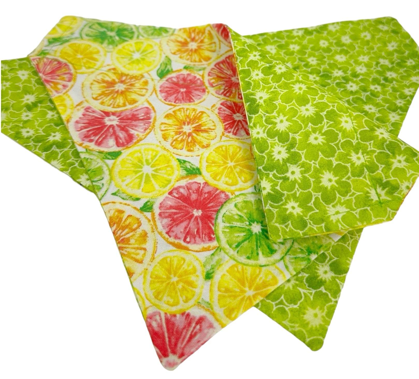 Get groovy with our Citrus and Green Flowers Handmade Reversible Slip-on Bandana! This stylish doggie bandana envokes 70's vibes with its green flower side and summertime fun with its refreshingly cool citrus motif and bright colors on the other. This beauty will surely make your dog stand out from the pack. So go ahead, and add a pop of color and fun to your pup's wardrobe.