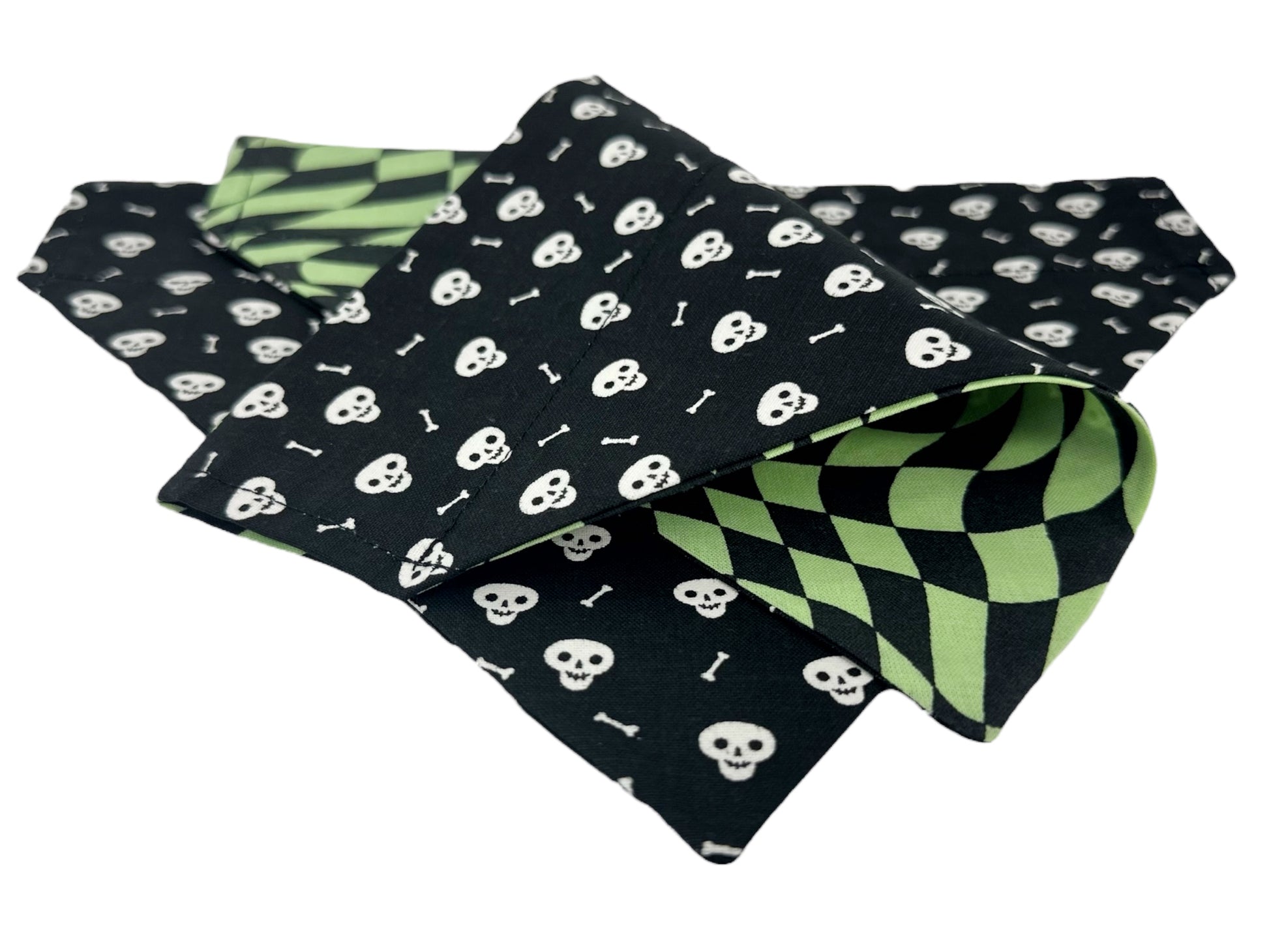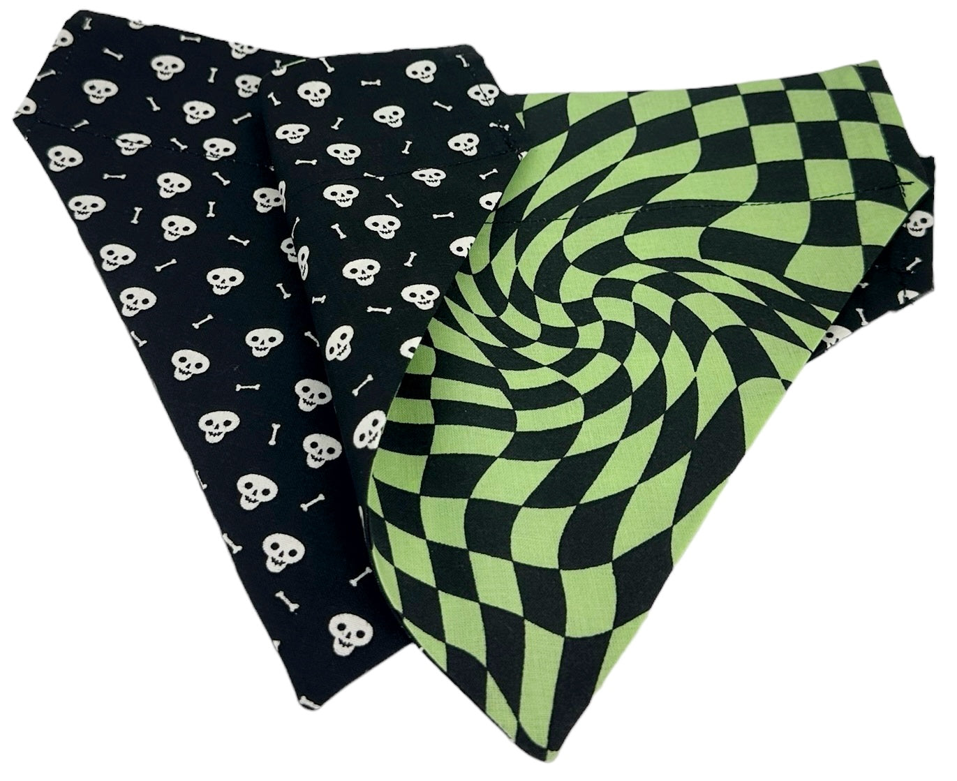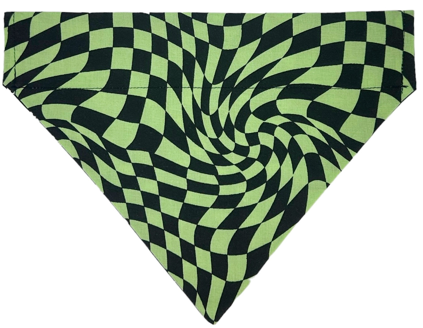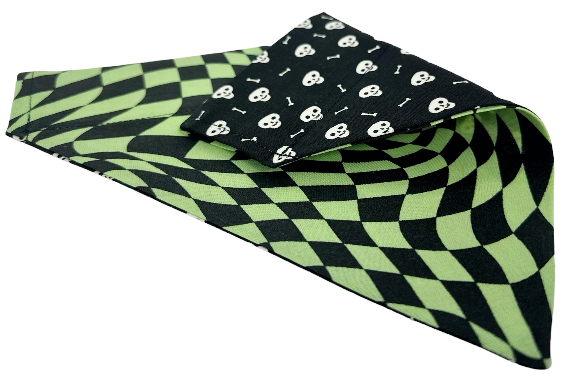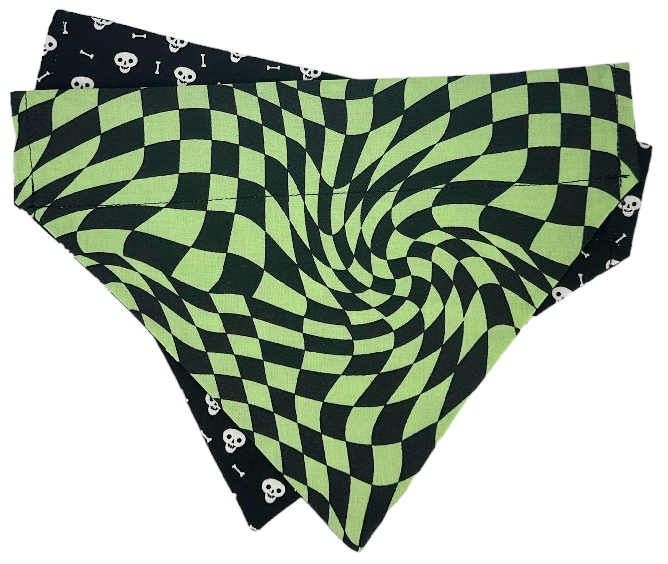 Unleash your pup's spooky side with our Warped Bones Glow-in-the-Dark Handmade Reversible Slip-on Bandana. Made with 100% cotton, this reversible bandana features a warped lime check pattern paired with a glowing skull and bones design (perfect for summer nights). Show off your and your pup’s unique style this summer.