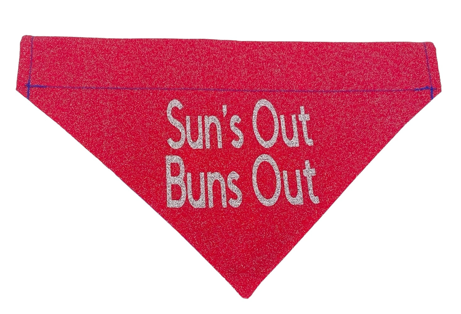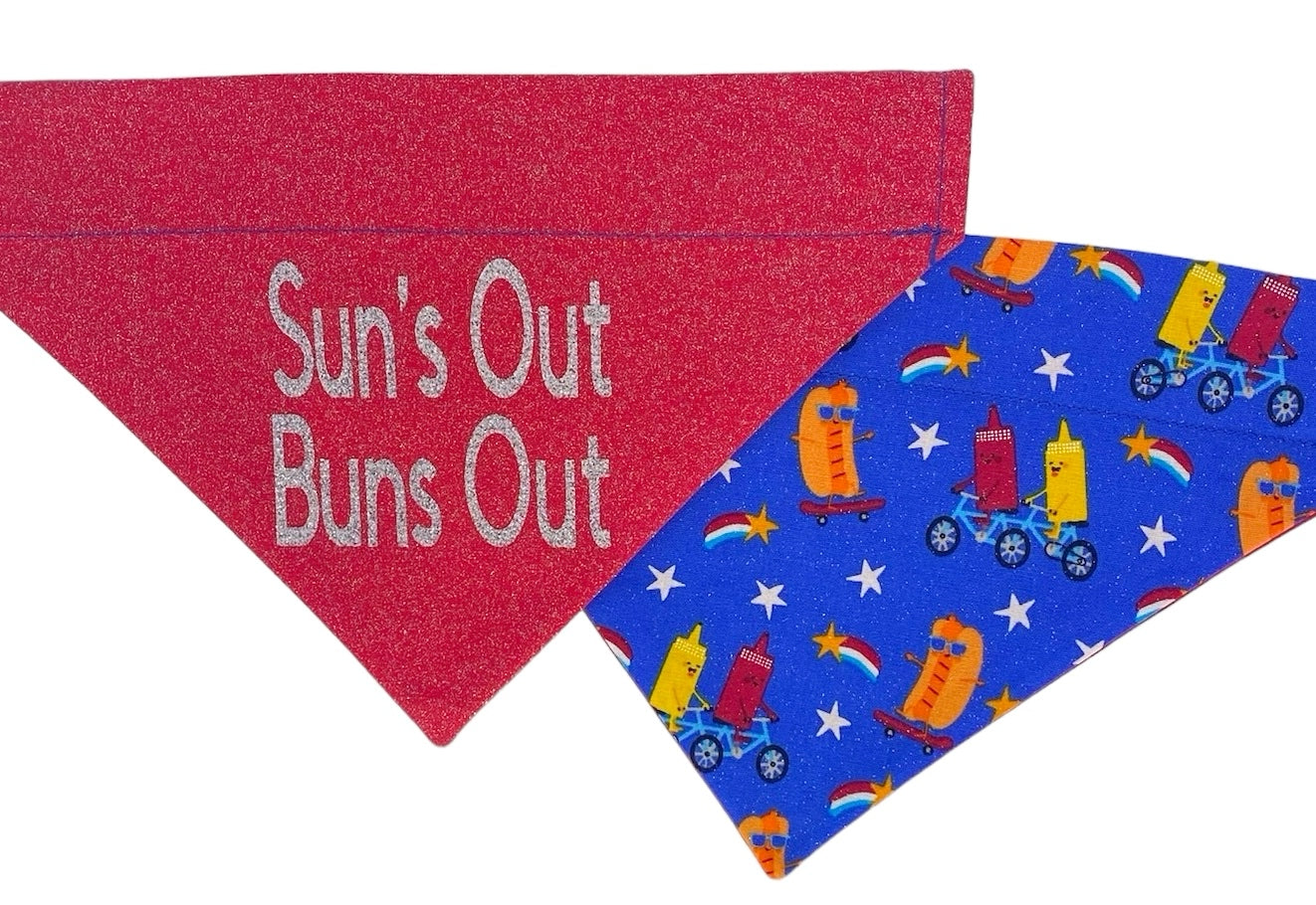 Get your pup ready for summer celebrations with our handmade, reversible slip-on bandana! This design features glitter accents and a playful "Sun's Out Buns Out" design. Our bandanas are easy to slip on and off your dog's collar and are perfect for any summertime adventure! In this show stopper, your pooch will be the hit of any BBQ cookout!