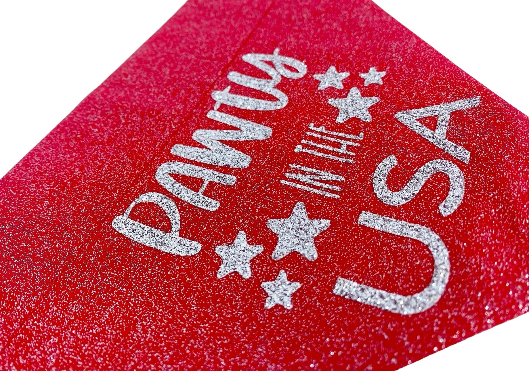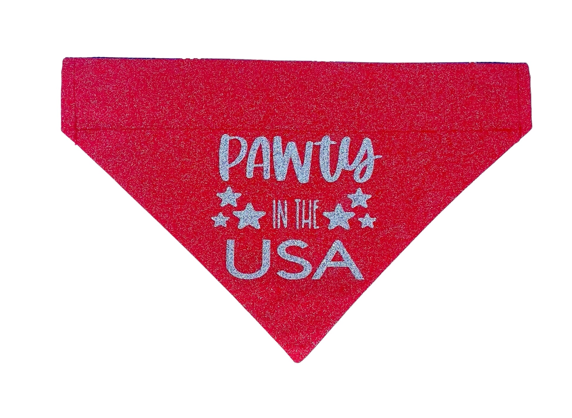 Celebrate the 4th of July in style with our "PAWty In The USA" handmade reversible slip-on bandana! This playful accessory features a red glitter background with the custom "PAWty In The USA" print on one side and patriotic red, white, and blue pawprints with glitter accents on the other. Perfect for adding some sparkle to your dog's Independence Day look! Rockin' this celebratory bandana will surely show your pup is the life of the PAWty!!