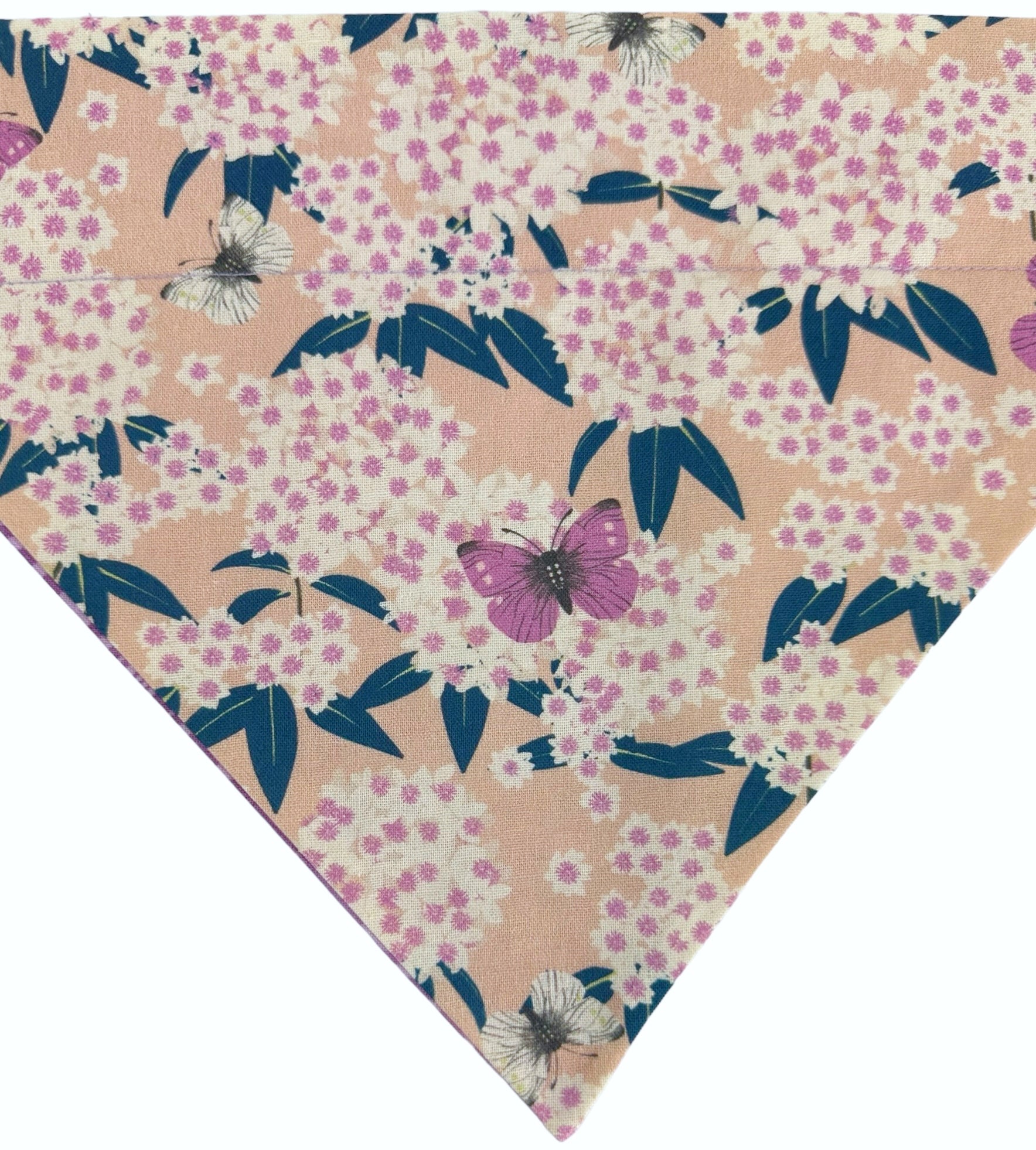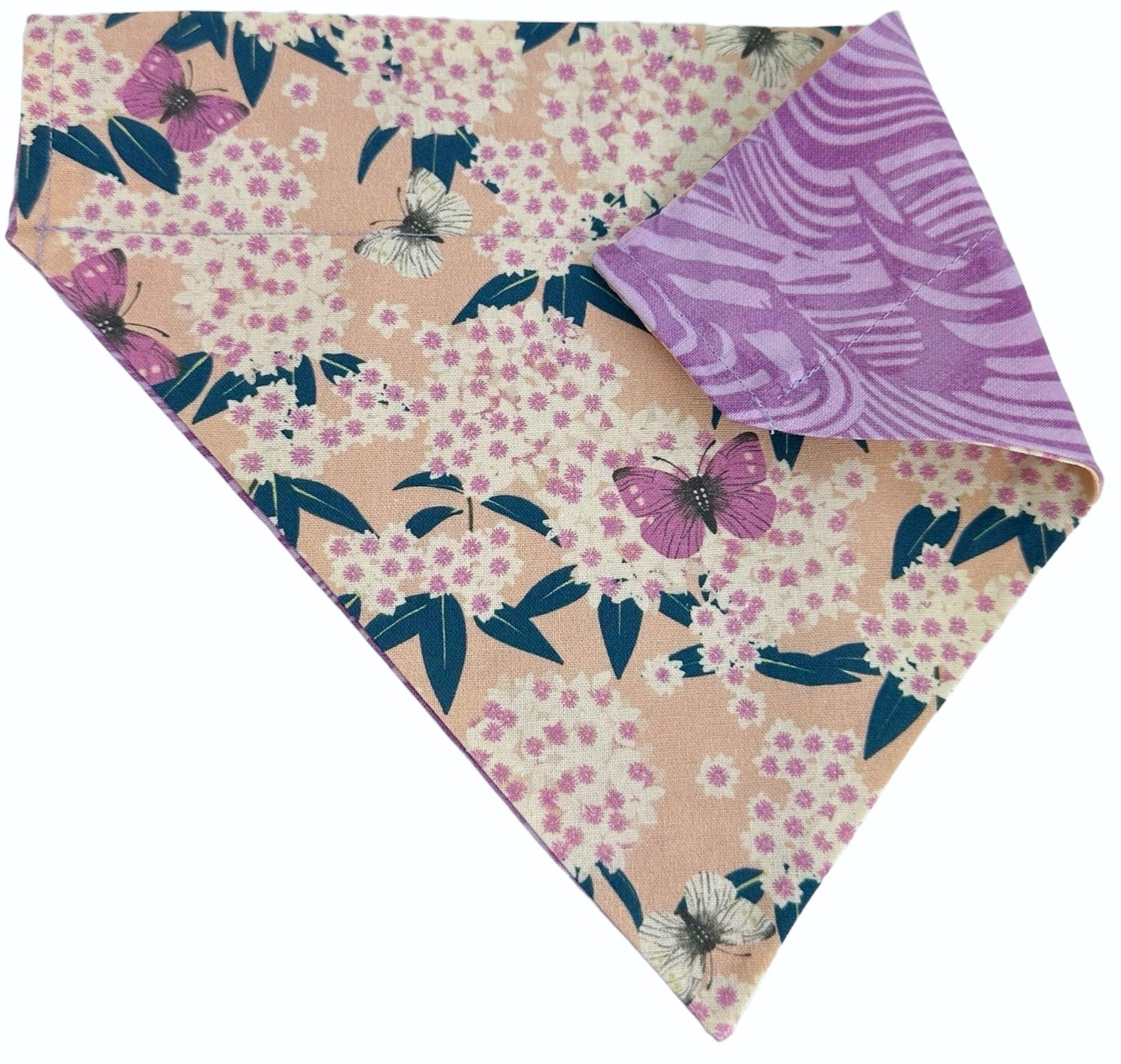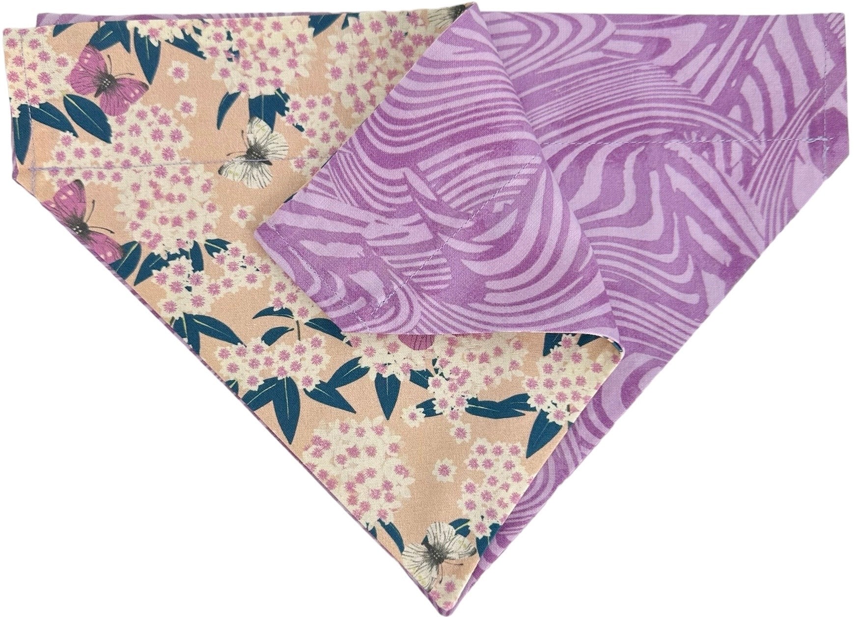 Cute and colorful, this handmade reversible bandana features beautiful butterflies and a fun purple marble print. Made from 100% cotton, it's perfect for summer outings with your pup. Keep them stylish while staying cool and comfortable.