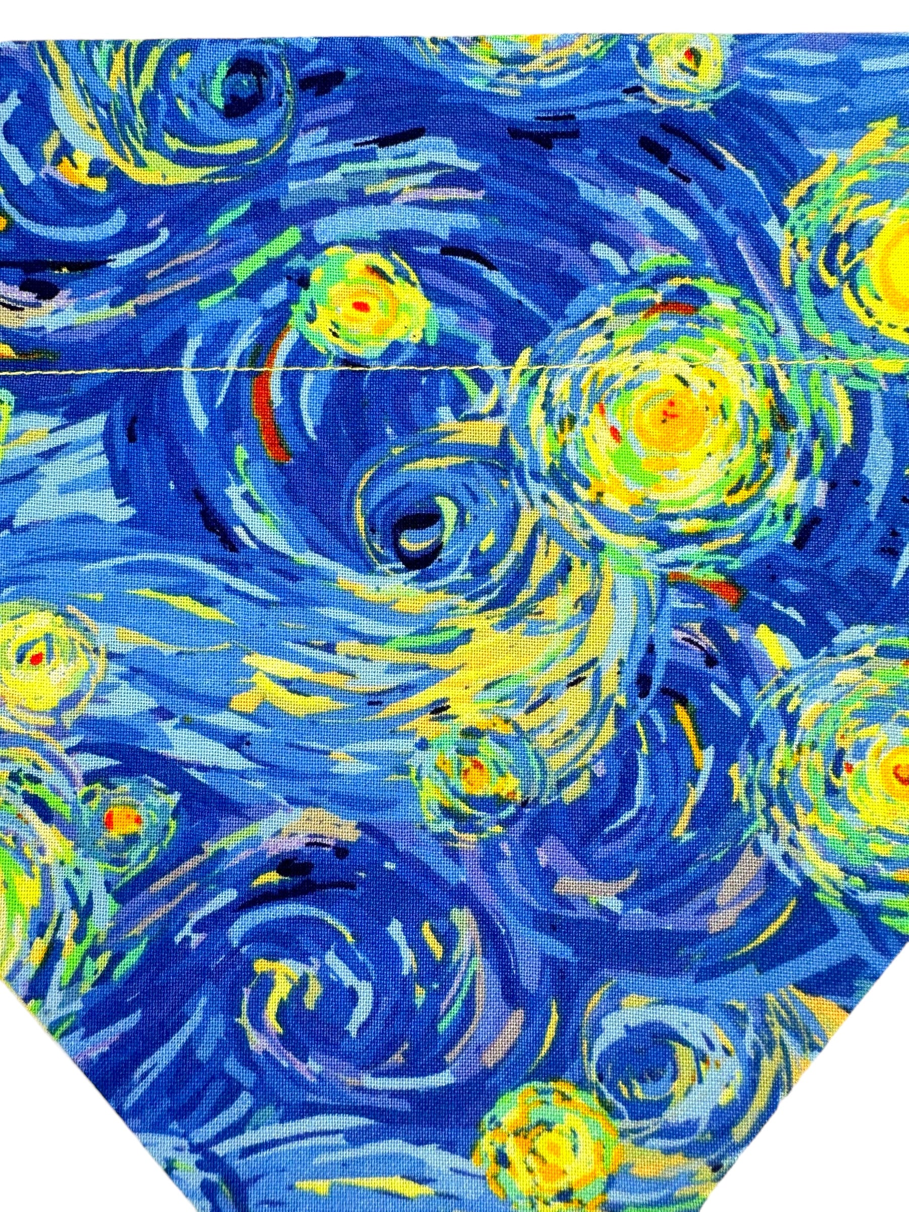 Get ready to add some fun and creativity to your dog's summer wardrobe with our Starry Night and Daisies Handmade Reversible Slip-on Bandana! This colorful bandana features adorable embroidered daisies on one side and a vibrant starry night print on the other. Made from 100% cotton and handmade with love, this bandana is perfect for the artistic and playful pooch. (Warning: may induce uncontrollable cuteness!)