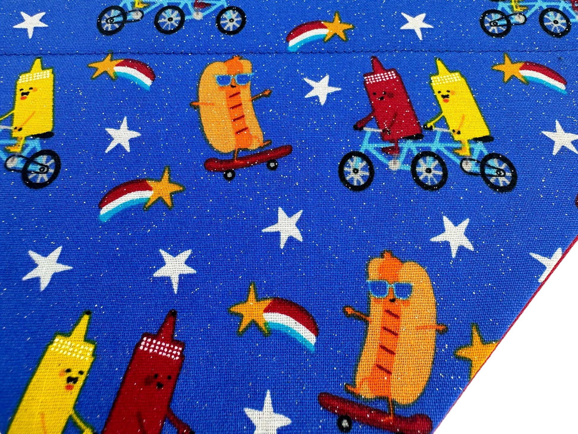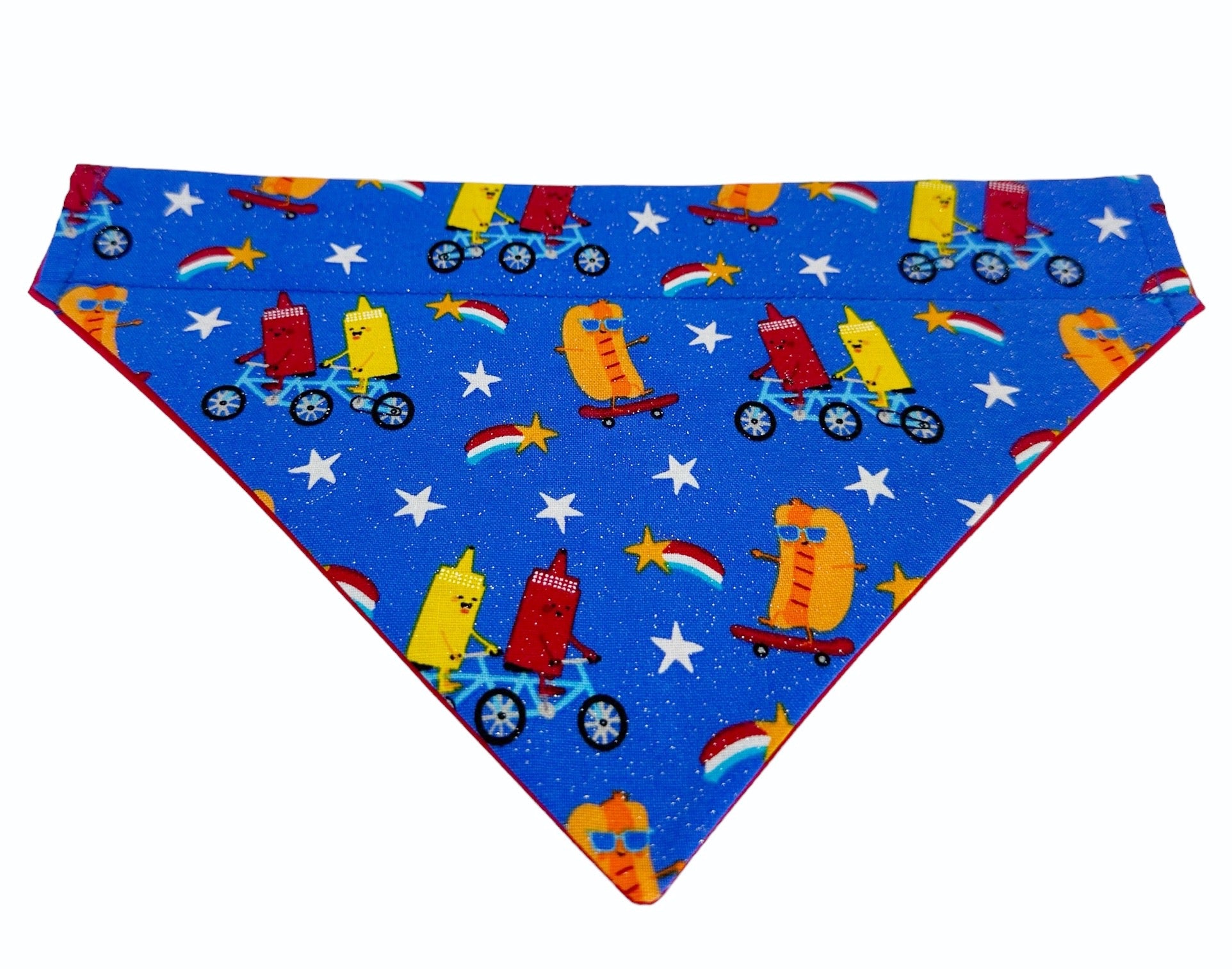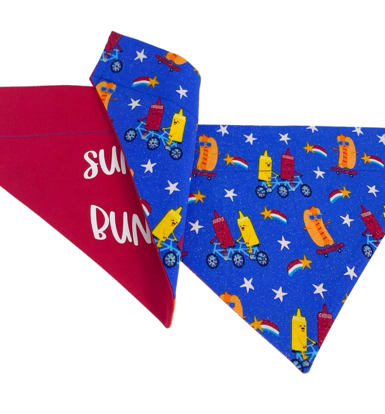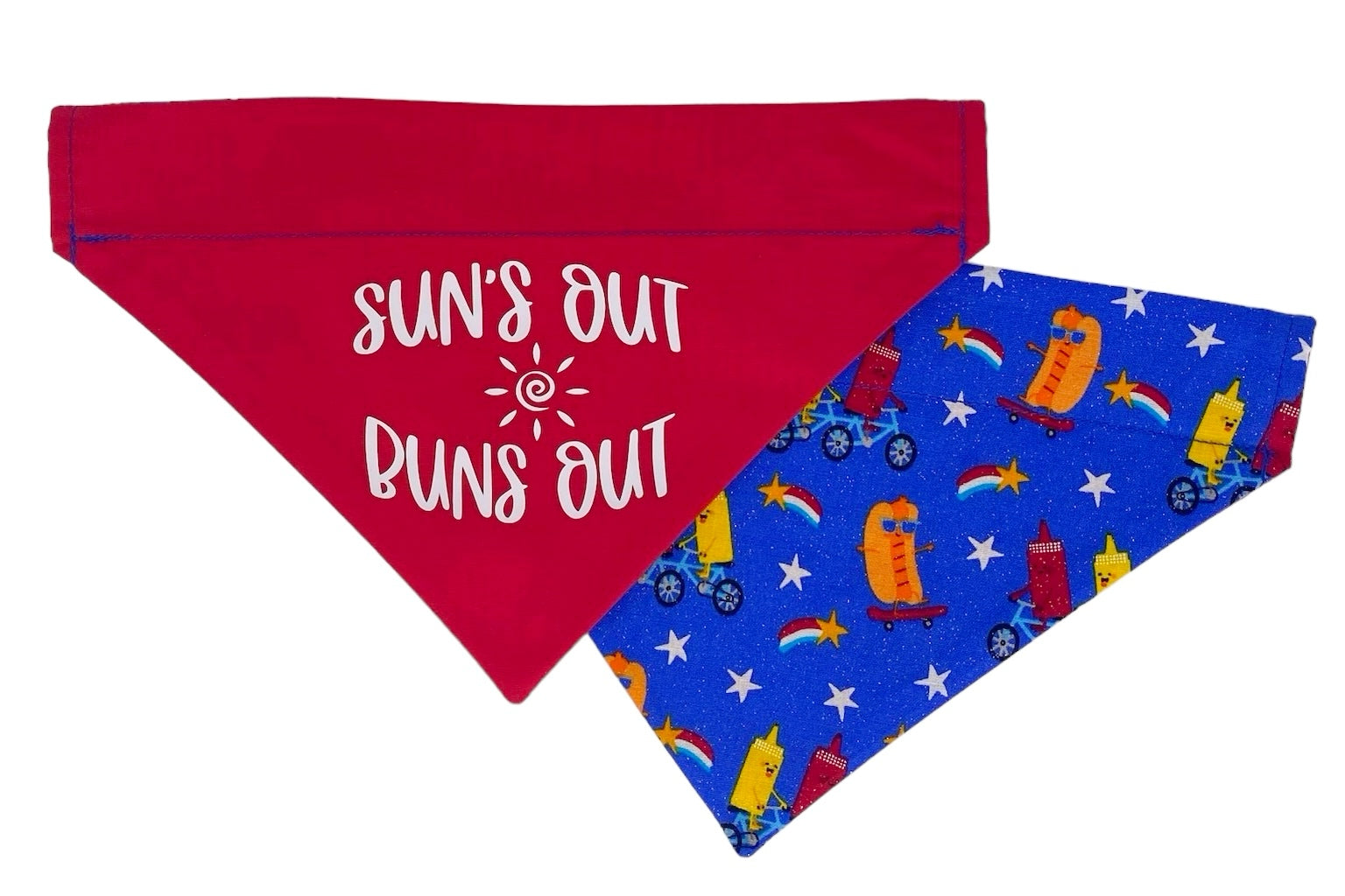 Get ready for some sizzlin' summer fun with our "Sun's Out Buns Out" handmade reversible slip-on bandana! This design features a playful "Sun's Out Buns Out" phrase with a whimsical sun on one side and a cool cookout theme, with glitter accents on the other. Your pup is sure to be the life of any summer BBQ in this pawsomely adorable bandana!