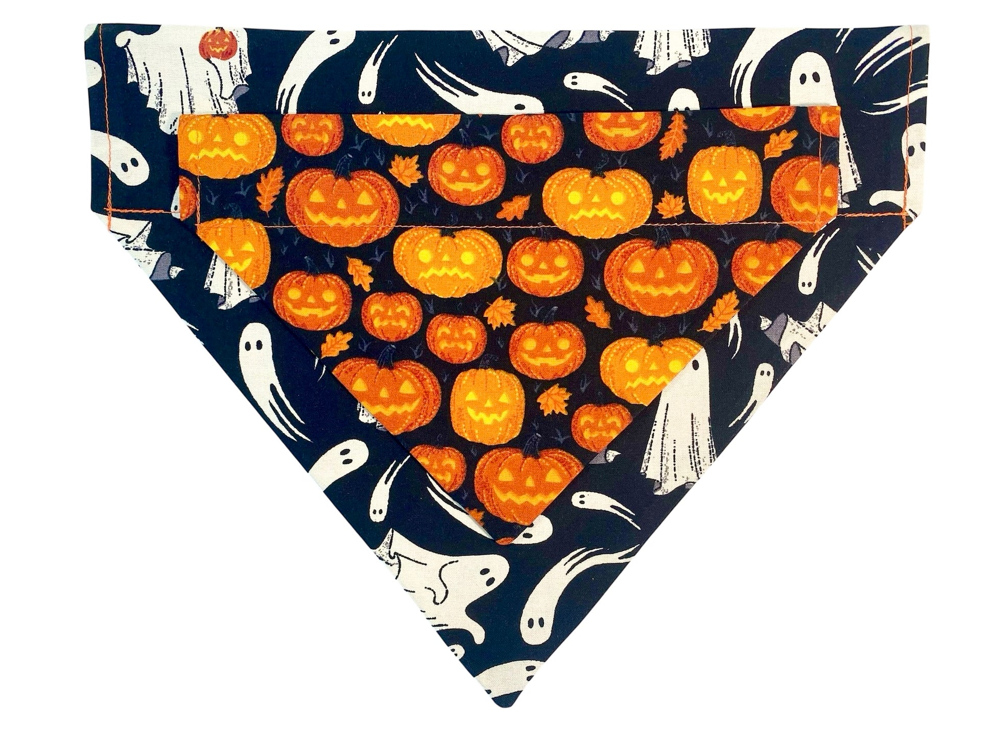Get your furry friend ready for a spooktacular time with the Trick or Treating Ghosts reversible pet bandana! The bandana is 100% cotton and handmade. One side features festive jack-o-lanterns while the other boasts playful ghosts. Perfect for Halloween, no tricks, just treats!