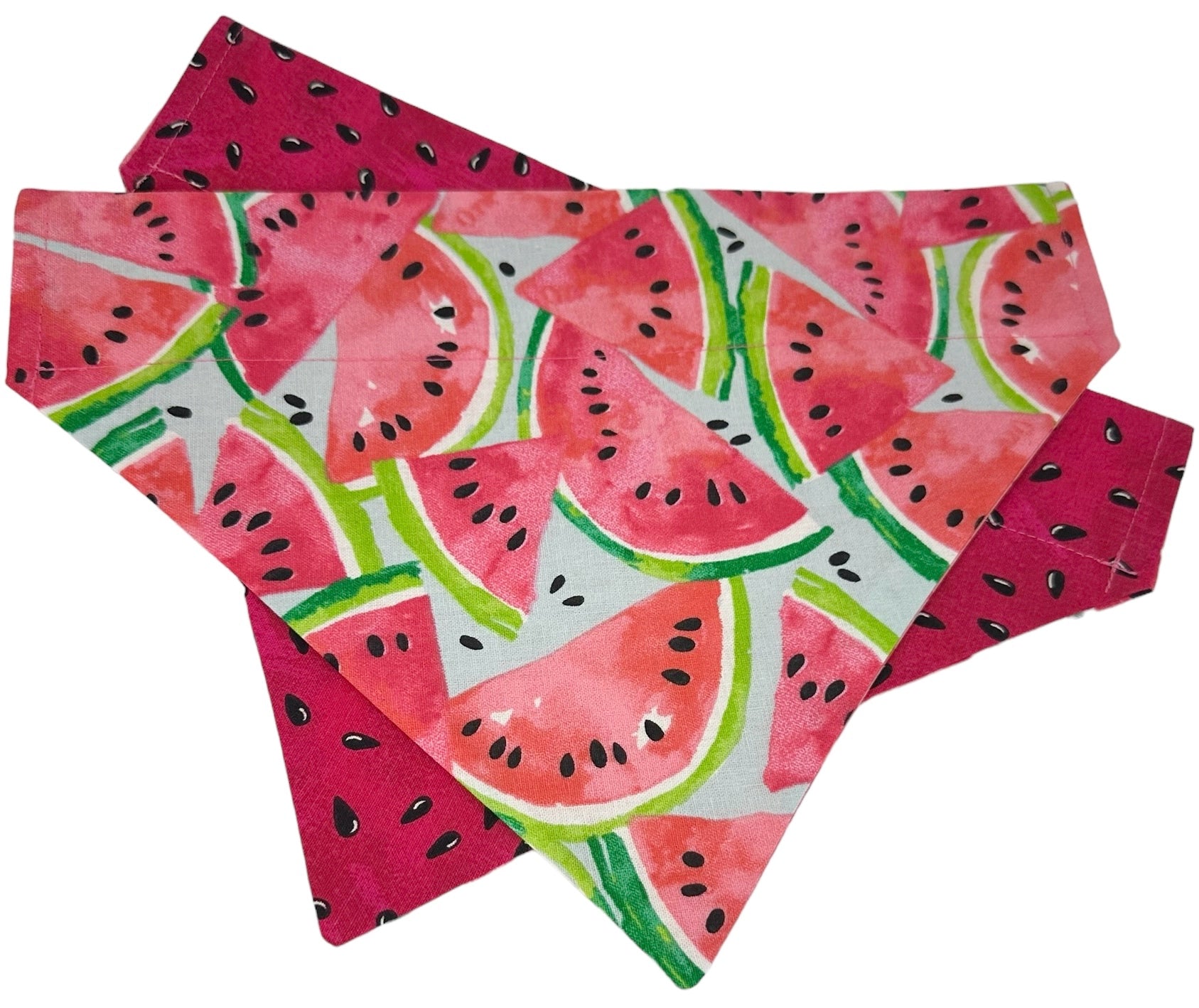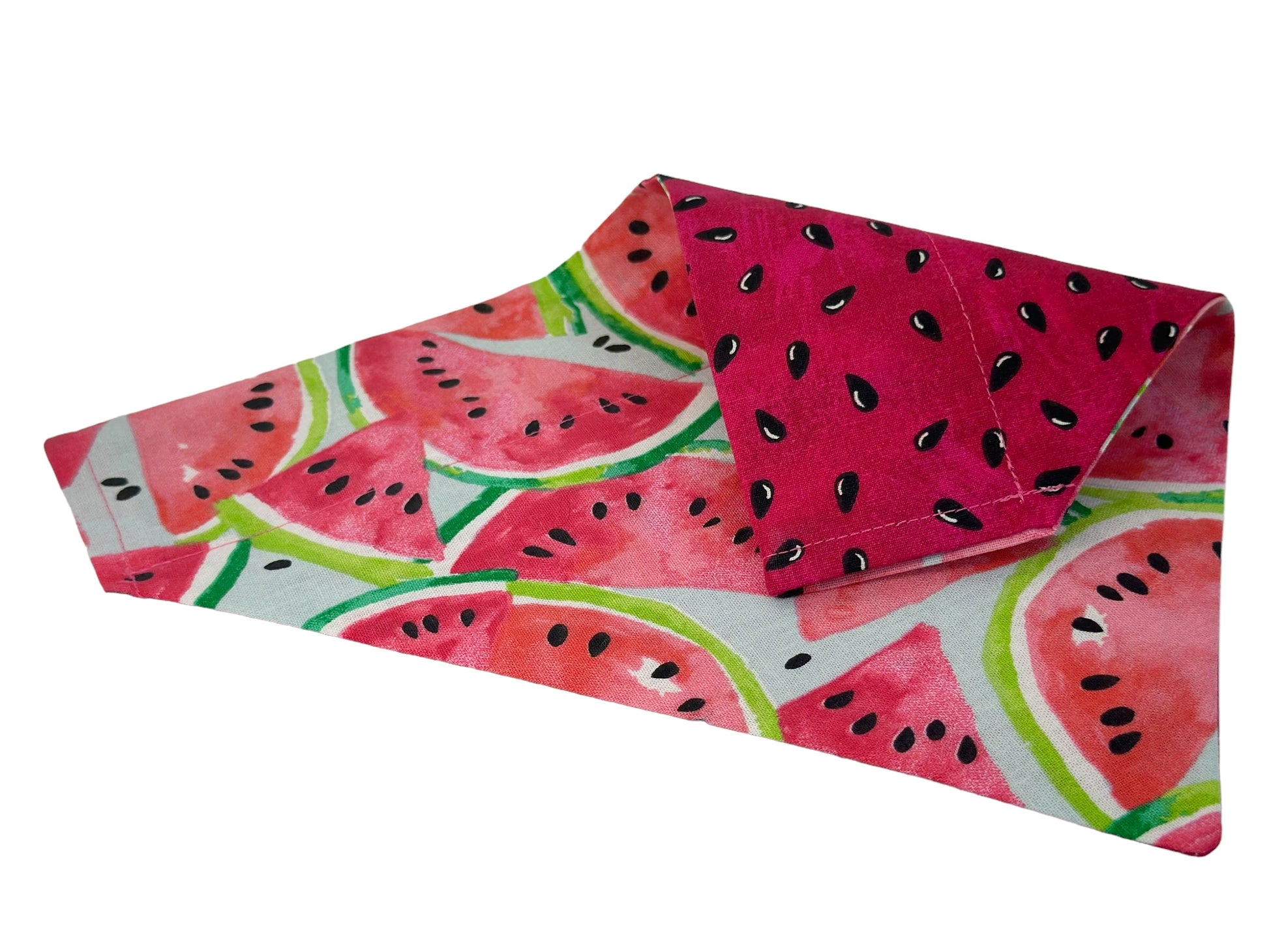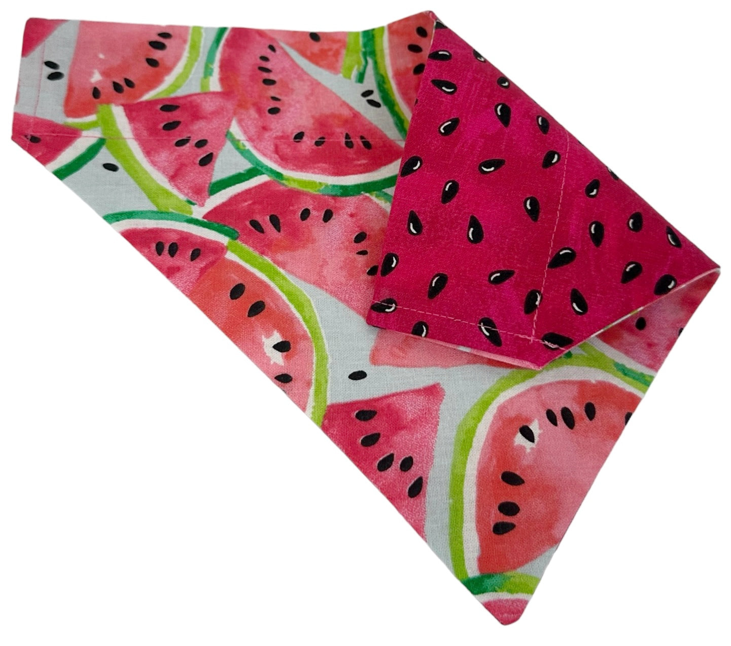 This Watermelon Handmade Reversible Slip-on Bandana is a must-have for your furry friend this summer! Made with 100% cotton and hand-sewn, this quality bandana is both stylish and fun. A perfect accessory for any dog, with its reversible design and double watermelon pattern.