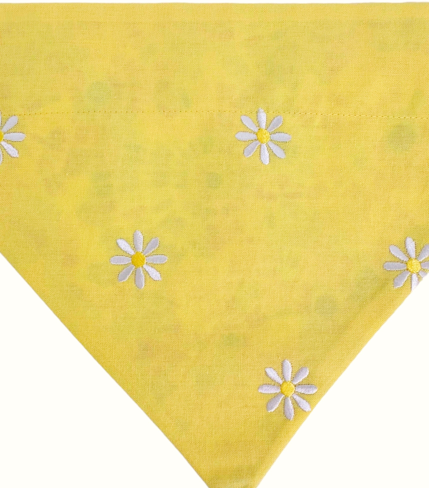 Add a pop of color and style to your furry friend's summer wardrobe with our Yellow Daisies and Mosaics Handmade Reversible Bandana! Handcrafted with an embroidered daisies on yellow and a colorful mosaic pattern, this 100% cotton bandana will have your dog looking fun, bright, and effortlessly stylish. Woof woof!